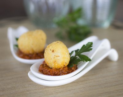 - Gebt reichlich Tomaten-Pesto auf einen Gourmet-Löffel und legt die frittierte Kugel darauf. Ein kleines Basilikumblättchen dazu lässt Euer Löffelchen noch appetitlicher erscheinen.