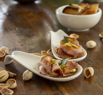 - Je dünner die Scheiben, desto zarter wirkt das Häppchen. Falls Ihr keine elektrische Schneidemaschine zur Hand habt, könnt Ihr die Entenbrust in leicht angefrorenem Zustand schneiden – so gelingen ebenfalls feine Scheiben.