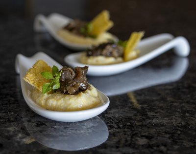 - Einen Gourmet-Löffel mit der Polenta-Creme füllen und das Auberginen-Tartar in eine kleine Mulde füllen. Ebenfalls mit kleinen Basilikum-Blättchen verzieren.