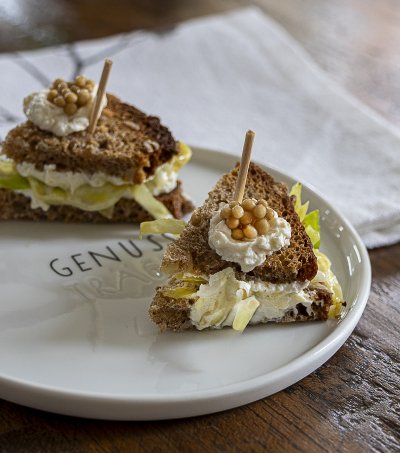 Das getoastete Sonnenblumen-Brot mit dem angemachten Frischkäse bestreichen, etwas Spitzkohl-Salat draufgeben und zwei Scheiben zu einem Sandwich zusammensetzen. Ggf. mit einem Zahnstocher fixieren.