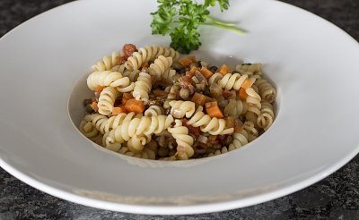 - Die Tomatensauce mit Zucker, Salz und Pfeffer abschmecken. Die Linsen abgießen und unter die Sauce mischen. Mit den Nudeln vermischen, final abschmecken und mit Petersilie, Zitronenabrieb und Parmesan servieren.